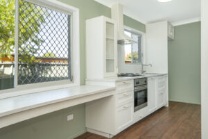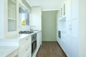 – Light-filled galley kitchen with gas cooktop, dishwasher and ample storage
