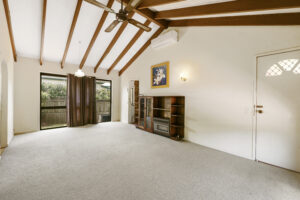 The lounge room features a high cathedral ceiling with exposed beams that gives a lovely sense of openness, and the brick feature walls add a nice character touch.